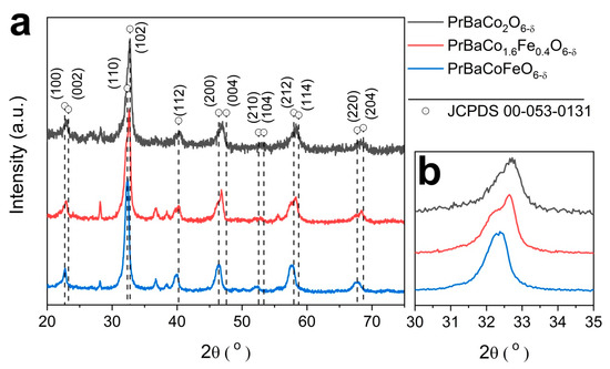 (a) comparison of X-ray diffraction (XRD) patterns of PBC (black), PBCF82 (red), and PBCF55 (blue). The XRD patterns are well indexed to those of PrBaCo2O6-δ from literature (JCPDS 00-053-0131); (b) magnified view of the main XRD peak.