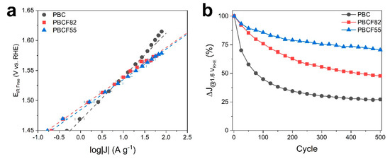 Electrochemical study comparing (a) Tafel plot of oxygen evolution reaction activities and (b) change in current densities with respect to the initial current density at every 25 cycles over 500 cycles between 1.0 and 1.6 VRHE of PBC (black), PBCF82 (red), and PBCF55 (blue).