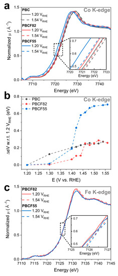(a) comparison of Co K-edge XANES spectra of PBC, PBCF82, and PBCF55 recorded at 1.2 and 1.54 VRHE; and (b) Co K-edge energy shift measured with respect to the edge position at 1.2 VRHE at each potential during operando flow cell tests; (c) comparison of Fe K-edge XANES spectra of PBCF82 and PBCF55 recorded at 1.2 and 1.54 VRHE.
