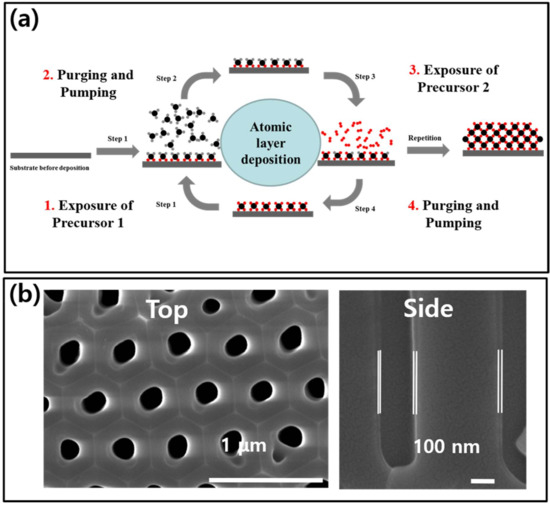 (a) The operating principle of atomic layer deposition is schematically described. (b) Scanning Electron Microscopy (SEM) images of TiO2 thin films on anodic aluminum oxide substrates deposited using atomic layer deposition (ALD). Edited from Reference [69].