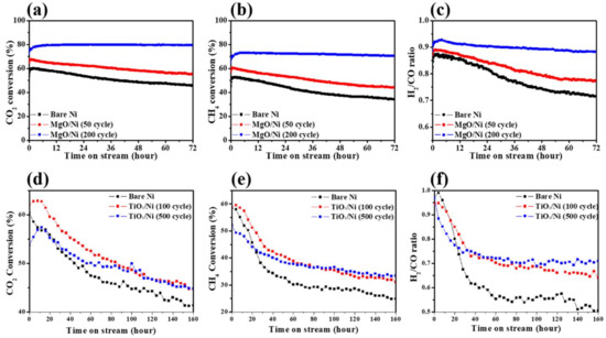 For Ni particles wrapped by MgO using ALD, improvement in both initial catalytic activity and sustainability of the catalytic activity with respect to bare Ni are observed. On the other hand, the initial catalytic activities of TiO2/Ni catalysts were slightly higher or lower than those of bare Ni depending on the number of ALD cycles applied for TiO2 deposition (100 cycles or 500 cycles). However, ALD deposition of TiO2 thin layers (either 100 or 500 cycles) always resulted in improved catalytic sustainability of Ni particles. These results indicate that TiO2 or MgO deposited on Ni does not completely block the active Ni sites, which can be attributed to the aforementioned crack formation within TiO2 or MgO layers wrapping Ni particles. CH4 and CO2 molecules can diffuse via the cracks of TiO2 and MgO and react to form CO and H2 on catalytically active Ni sites. In addition, with increasing thickness of TiO2 or MgO layers within 20 nm of the film thickness, the initial reactivity and stability of catalyst are enhanced [13,30]. Even though the TiO2 shell shows higher surface areas corresponding to the higher crack density than MgO, MgO produces much higher enhancement effects of the catalytic activity and stability of Ni for DRM than TiO2 shells. The origin of this result will be discussed in detail later. Ultimately, MgO/Ni with an MgO shell thickness of ~20 nm did not show any deactivation for DRM under ambient pressure conditions for longer than 3 days (Figure 3a–c).
