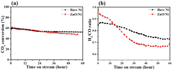 (a) CO2 conversion and (b) ratio of H2 to CO, which are products of the DRM reaction, for bare Ni and ZnO-wrapped Ni. The DRM reactions were carried out at 800 °C under atmospheric conditions with a constant flow of the gas mixture (CH4:CO2 = 1:1, total flow rate of 20 mL/min).