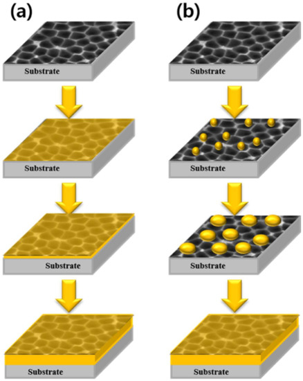 Schematic illustration of thin film growth based on (a) Frank-van der Merwe and (b) Volmer-weber modes.