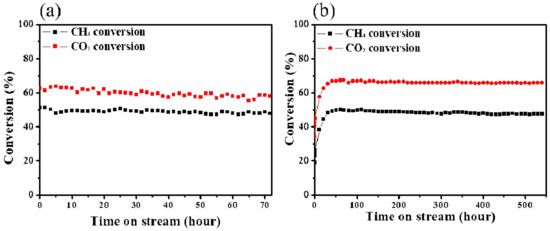 (a) CH4 and CO2 conversion of Ni/TiO2 catalysts at 800 °C for 72 h. (b) CH4 and CO2 conversion of Ni/alumina at 800 °C for 550 h. The DRM reactions were carried out at 800 °C under atmospheric conditions with a constant flow of the gas mixture (CH4:CO2 = 1:1, total flow rate of 20 mL/min). Edited from Reference [57].