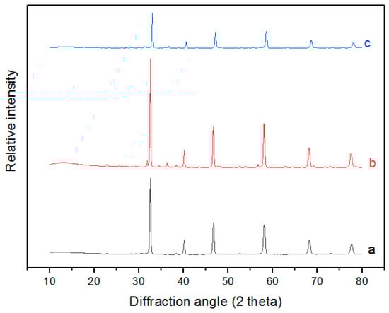 X-ray diffraction (XRD) patterns of (a) La0.2Sr0.25Ca0.45TiO3−δ (LSCTA-), (b) La0.2Sr0.25Ca0.45Ti0.95Zn0.05O3−δ (LSCTZ5) (air), and (c) LSCTZ5 (reduced), synthesized via the solution phase Pechini method.