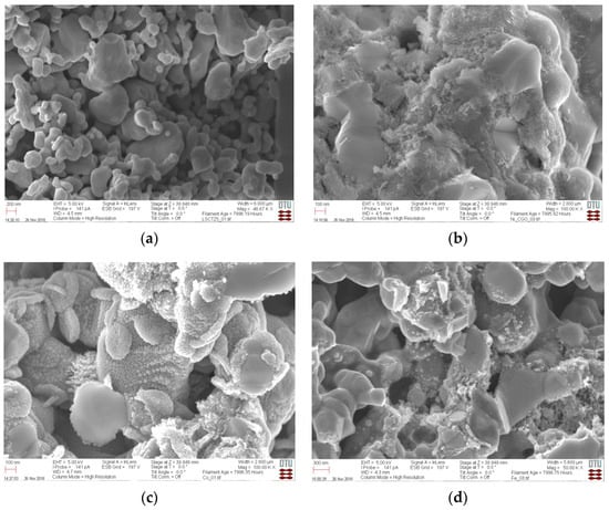 Microstructure analysis of the LSCTZ5 anode infiltrated with Ni, Fe, Co, and Ni-CGO before testing shows a porous backbone structure with particle sizes between 0.1 μm and 1 μm. A comparison of LSCTZ5 without and in the presence of infiltrated electrocatalysts before testing is given in Figure 2. Figure 2b–d indicates the presence of infiltrated material with nano-structured features after infiltration. The results indicate a rather homogeneous distribution of infiltrated nanoparticles on the porous backbone structure; hence, in our studies, infiltration worked effectively to prepare the composite structures.