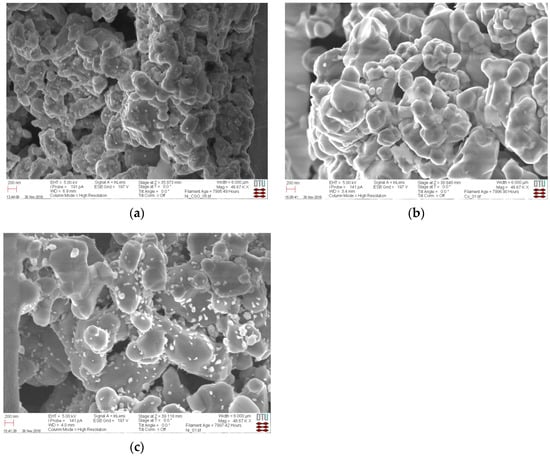 The micrographs of infiltrated LSCTZ5 anode materials after testing at 850 °C, in which the presence of isolated sub-micronparticles can still be distinguished, are given in Figure 3. While Ni-CGO infiltration results in particles of up to 100 nm, larger particle sizes of up to a couple of 100 nm are indicated for Co and Fe infiltration.
