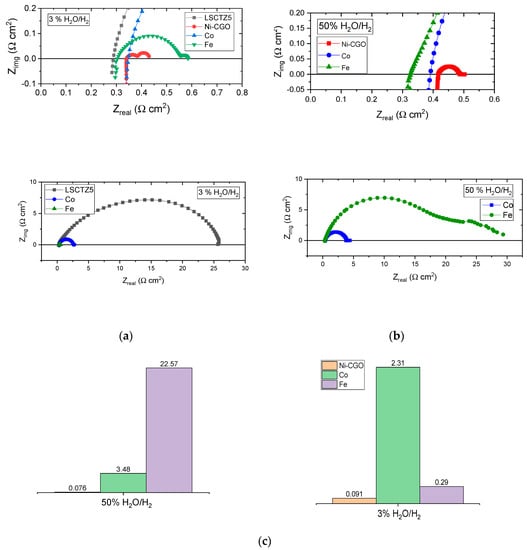 Electrochemical impedance spectroscopy (EIS) data Nyquist plot from Ni-CGO-, Co- and Fe-infiltrated LSCTZ5 at 750 °C in (a) 3% H2O/H2 and (b) 50% H2O/H2; the high frequency intercept is magnified in a separate (c) bar graph plot for comparison with Rp values given in Ω cm2.
