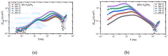 Bode plot from Fe-infiltrated LSCTZ5 at different temperatures in (a) 3% H2O/H2 and (b) 50% H2O/H2.