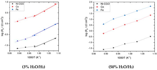 To study temperature dependence, the data was analyzed using an Arrhenius plot as shown in Figure 6 for Ni-CGO-, Co- and Fe-infiltrated LSCTZ5. In this plot, the common logarithm of polarization resistance is plotted against the inverse of temperature; the activation energy was calculated from the slope of the curve by multiplying it with the gas constant as well as the Faraday constant, with the results given in Table 4 [30].