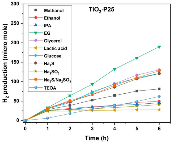 Photocatalytic H2 production efficiency of TiO2-p25 using various sacrificial agents.