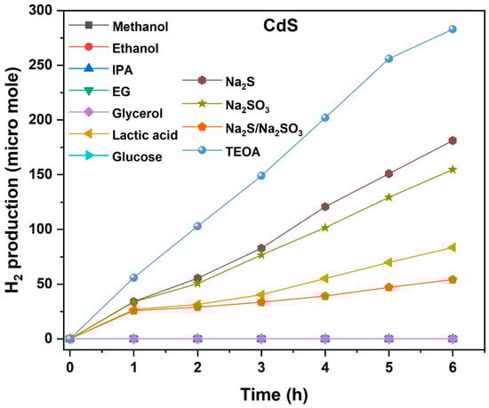 Photocatalytic H2 production efficiency of CdS using various sacrificial agents is shown in Figure 4. The use of TEOA, Na2S, Na2SO3, Na2S/Na2SO3, and LA as sacrificial reagents resulted in H2 formation. CdS/TEOA system showed the maximum efficiency of 283.2 µmol of H2 as compared to all other sacrificial agents. The efficiency of CdS/Na2S, CdS/Na2SO3, CdS/LA systems was found to be 181.2 µmol, 154.8 µmol, and 84 µmol, respectively. The mixture of CdS/Na2S/Na2SO3 showed the lowest H2 production of 54 µmol after 6 h. Bare CdS is not stable under prolonged light irradiation because the sulfide ions on its surface are rapidly oxidized into sulfur through the reaction with photo-generated holes (photo-corrosion – CdS + 2h+ → Cd2+ + S) [308,446,447]. The sulfide oxidation of CdS can occur before the oxidation of water by holes [308,447]. Hence, the H2 production efficiency of CdS highly relies on the effective binding of sacrificial agents on its surface. The results showed that amine and sulfide/sulfite might be strongly bound to the CdS surface and it could effectively consume the holes as compared to alcohol and sugars. It is obviously noted that H2 is produced in high alkaline (amine, sulfide, and sulfite) and acidic (LA) pH mixtures when compared to neutral pH (alcohols and sugar). LA is converted into pyruvic acid and CO2 during the water-splitting reaction; this may slightly influence the pH and polarity of the reaction mixture. The sulfide ions from Na2S stabilizes CdS surface to terminate the surface defects originated from photo-corrosion. The electron-hole recombination process is strongly restrained by the sulfide ions at alkaline pH. When CdS is suspended in a water medium, thiol (Cd-SH) and hydroxyl (Cd-OH) groups are developed on its surface, which are highly pH dependent [310]. In the case of Na2S, the pH of the medium is alkaline, sulfide (S2−) and hydrogen sulfide (HS−) are formed when Na2S is dissolved in water [310]. During light irradiation, S2− and HS- are quickly oxidized into sulfate (SO42−) and polysulfide (S42−, S52−) ions, respectively [310]. The oxidation of sulfide by the photo-generated holes is much preferential as compared to the photo-corrosion of CdS [112]. The precipitation of yellow colored polysulfide ions diminishes the photocatalytic efficiency via acting as an optical filter and competing with the H2 generation reaction. This could be restricted by the addition of Na2SO3 to generate more HS- and S2O32− ions to enhance the photocatalytic activity [292]. However, the results shown in Figure 4 suggest that H2 production efficiency of Na2S/CdS or CdS/Na2SO3 are higher than that of CdS/Na2S/Na2SO3. The reasons could be predicted by the photolysis experiments of sacrificial agents. The pH of TEOA/water mixture would be around 12, which could enhance the H2 production efficiency via strong interfacial bonding on the CdS surface and its reaction with photo-generated holes [204].