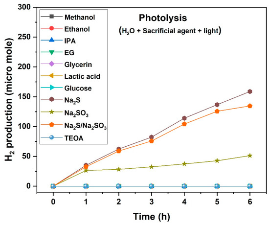 H2 production efficiency of sacrificial agents without photocatalyst (photolysis).