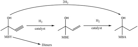 Selective hydrogenation is an important transformation in the synthesis of fine chemicals and pharmaceutical industry. Specifically, 2-methyl-3-buten-2-ol (MBE) is a compound of interest as it is used as a starting material in the production of vitamins A and E as well as an intermediate chemical in fragrances and flavorings [14]. As shown in Figure 1, MBE is formed by partial hydrogenation of 2-methyl-3-butyn-2-ol (MBY). Full hydrogenation of MBY or further hydrogenation of MBE can take place to form 2-methyl-3-butan-2-ol (MBA) and C10 dimers of MBY may also be produced. Therefore, increasing the conversion of the raw materials and the selectivity towards the MBE are of significance to minimize the impact on the environment by avoiding energy intensive separation processes and waste formation. Even an improvement in selectivity as minor as 1% can contribute to several thousands of tons of the product leading to substantial profits especially in industries as large as pharmaceutical manufacturing, which is estimated to be worth £1.3 billion in 2018–2019 in the UK alone [15,16].