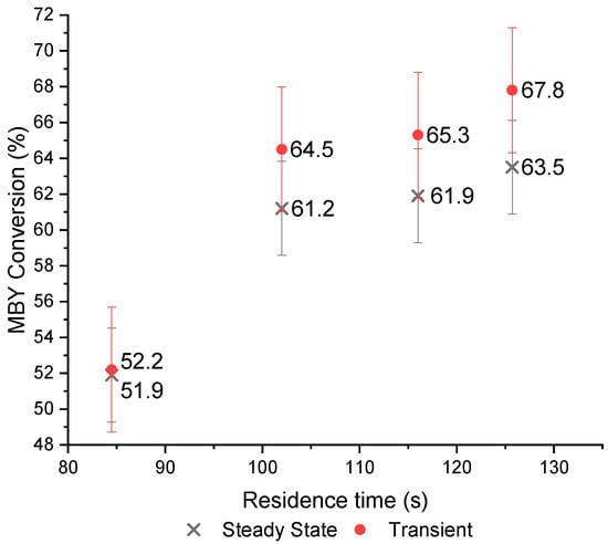 Conversion of MBY with residence time under steady-state and transient conditions where A = 5 °C and τ = 75 s.