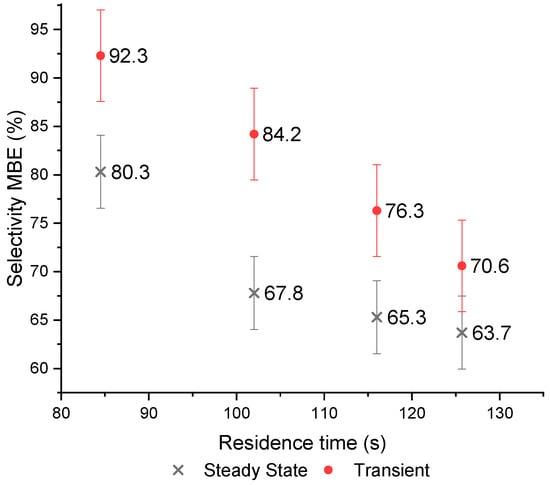 Figure 3 shows that for all of the residence times tested, an increase in selectivity is observed under transient operation. Shorter residence times result in a slightly higher selectivity towards MBE which is due to the insufficient time for the MBE to further transform into by-products. This is supported by the fact that the only overlap of the standard error bounds is seen at the longest residence time.