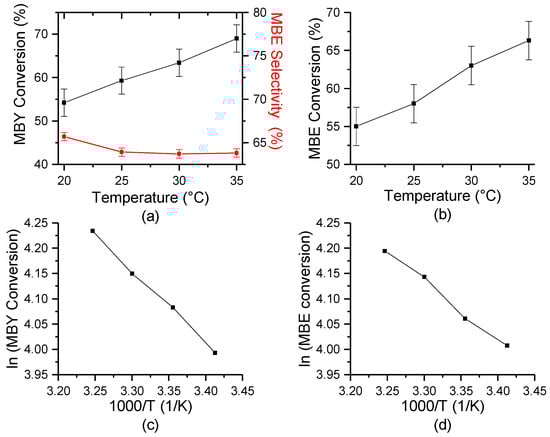 (a) Conversion of MBY and MBE with temperature; (b) conversion of MBE with temperature; (c) Arrhenius plot for MBY conversion; (d) Arrhenius plot for MBE conversion.