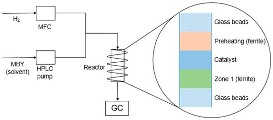 The set up consisted of a packed bed with a general structure consisting of various heating and catalytic zones. The design and characteristics of such micro- and milli-reactors have been described in detail elsewhere [30,31,32]. Comprehensive methods for catalyst synthesis may also be found here [21,31]. The set-up of the reactor is presented in Figure 6. The configuration of the reactor consisted of catalytic and heating zones composed of 150–300 μm of catalyst pellets, 106–120 μm ferrite particles and 100–150 μm glass beads. The initial concentration of MBY in xylene was 0.25 M, and liquid flows of 0.07, 0.1, 0.2 and 0.3 mL/min were used. The gas flow rate was 10 mL/min, and the reaction was conducted at atmospheric pressure. The products were analyzed using an offline gas chromatography equipped with a flame ionization detector.