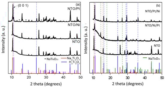 A less marked behavior is observed in single metal-loaded samples, as it is observed, also in Figure S1, Ni- and Pt-loaded NTO present a reduction in the (0 0 1) reflection intensity, as a result of the decrease in the interlayer distance and more evident in the NTO/Ni sample, which suggests the possible introduction of Ni species between the TiO6 octahedrons.