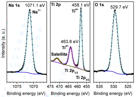 Figure 2 shows the de-convoluted spectra of Na 1s, Ti 2p, and O 1s species in the bare Na2Ti3O7 sample; as it can be noticed, Ti 2p spectrum was resolved in three single peaks characteristic of Ti2p3/2 and Ti 2p1/2 orbitals and their respective satellite, all of them located at 458.1, 463.8, and 471.3 eV, respectively, and representative of Ti4+ species [33]. On the contrary, Na 1s and O 1s present both a single peak located at 1071.1 and 529.7 eV, respectively, which are related to the presence of Na+ and O2− [34,35] species in the sample. All of these peaks corroborates the presence of a single Na2Ti3O7 phase.