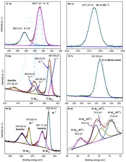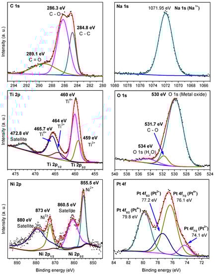 A different behavior is observed in the NTO/Ni/Pt sample, which is evidenced on its de-convoluted XPS spectra presented in Figure 3. In this context, the Ti 2p region was resolved on its representative Ti 2p3/2 and 2p1/2 peaks and its satellite at 472.8 eV. Both Ti 2p3/2 and 2p1/2 peaks were fitted in two doublet ones centered at 459, 460, 464, and 465.7 eV, respectively. Both peaks located at 459 and 465.7 are representative of the Ti4+ species [33]; meanwhile, the 460 and 464 peaks correspond to the Ti3+ species [36]. The presence of these peaks corroborates the Ti4+/Ti3+ mixture in the intermediate phase formed during bi-metallic synthesis (NaTi8O13). A peak of Na 1s was found at 1071.95 eV (Figure 3) as evidence of Na+ species present in the sample [34]. The O 1s spectrum was resolved in a very intensive peak at 530 eV, corresponding to O2− species [35] related to the formation of O–M bonds, where M can be any of the present metals. A peak at 534 eV was resolved suggesting the presence of water in the surface, as a result of the lack of thermal treatment after Pt photo-deposition process. This step was omitted in order to avoid the Pt oxidation by temperature.