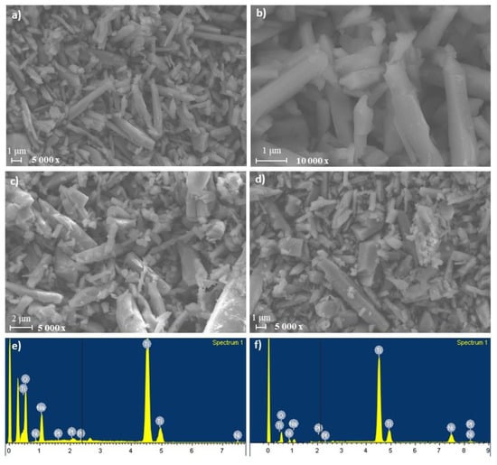 SEM images of Na2Ti3O7 samples are shown in Figure 5a,b. As it can be seen, this material exhibits a whisker-like morphology, which is characteristic of some alkali metal titanates [40]. In general, the samples have an apparent average whisker length of around 5 μm, resulting from the high temperatures used during solid-state reaction synthesis.