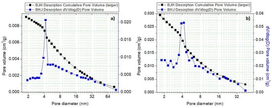 N2 adsorption was used for determining the BET surface area of the samples. Due to the high-temperature thermal treatment applied during the synthesis method, the bare titanate exhibits a relatively low surface area (<10 m2·g−1), which practically remains unmodified after single Ni or Pt decoration. However, in the case of bimetallic samples, surface areas had a significate variation, which can be attributed to the secondary process. The NTO/Ni/Pt sample exhibited a BET area increase, although the value remains lower than 10 m2·g−1. On the contrary, the NTO/Pt/Ni sample presented a six-fold increase (28 m2·g−1) compared with sample only loaded with Pt (4 m2·g−1). In addition, pore size distributions of both samples are presented in Figure 6. As it is evident, higher pore volume was obtained in sample NTO/Pt/Ni (0.029 cm3·g−1) compared with NTO/Ni/Pt (0.009 cm3·g−1). This difference in pore volume between samples can be attributed to the sodium loss during the Pt photo-deposition and Ni impregnation processes forming some intermediate phases with higher pore volume than bare titanate. The results from BET analysis of all materials synthesized are summarized in Table 3.