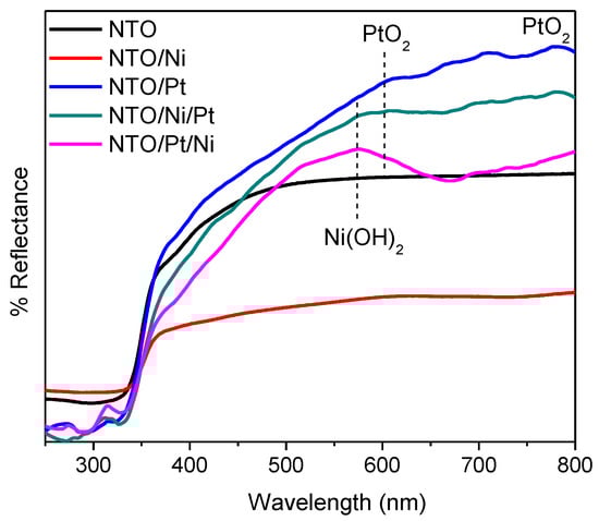 In order to perform the optical characterization, diffuse reflectance UV–VIS analysis of the samples was carried out. Figure 7 shows the diffuse reflectance spectra of NTO metallic and bi-metallic samples. A sharp decrease in reflectance is observed around 365 nm, which makes evident the higher absorption of these materials under UV radiation. As it is evident, a decrease in reflectance is observed with the Ni impregnation. In addition, the NTO/Pt/Ni sample presents a transition around of 550 nm, which is representative of Ni(OH)2 species [41] confirming the previous assumption made with XPS results. On the contrary, this transition is less visible on the NTO/Ni/Pt sample, probably due to the Pt species in the outer layer. No Ni(OH)2 transitions were observed in the NTO/Ni sample as a result of the thermal treatment performed after impregnation suggesting the presence of only NiO particles. Furthermore, some other transitions less marked are observed, mainly in the Pt loaded samples between 500–800 nm; some of them can be considered representative of PtO2 or Pt(OH)2 species [42,43], confirming the presence of these phases as a result of the incomplete Pt reduction over catalysts.