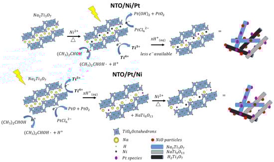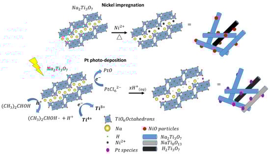 As a result of the further characterization of the prepared catalysts, it is possible to propose a reaction mechanism of the phase transition during both processes (impregnation and photo-deposition). Figure 8 shows the proposed mechanism of the deposition of a single co-catalyst. As it can be observed, during the Ni impregnation, as a result of the performed conditions, it is possible to exchange some Na+ species by Ni2+ ones into the TiO6 layers [45], reducing the interlayer distance between them. Furthermore, NiO species were deposited over the NTO surface.