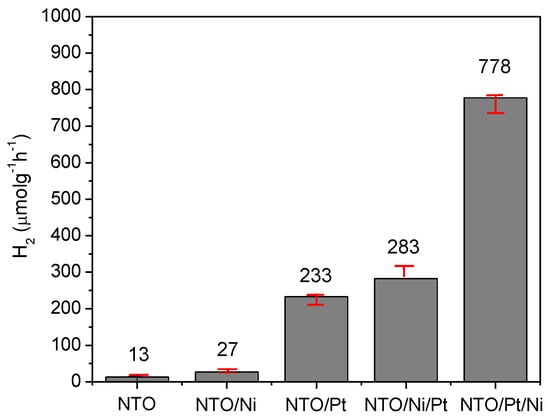 The use of a single co-catalyst (Ni or Pt) on this NTO material leads to an increase in the hydrogen production, moderate in the case of nickel and higher in the case of the Pt, as shown in the same figure. This behavior can be mainly due to the presence of Pt on the NTO surface, which improves the carrier transfer step. Comparison on the effect of Pt and Ni deposition shows more than one order of magnitude improvement (factor 18) for Pt, while Ni deposition hardly favors the hydrogen evolution in relation to the bare NTO, with a two-fold increase [26,48].