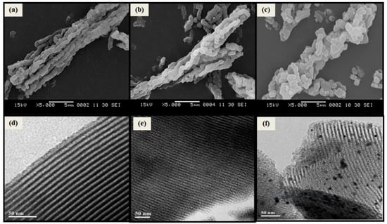 Representative (a–c) SEM (5000× magnification) and (d–f) TEM (300,000× magnification) micrographs of SBA-15 (a,d), Al–SBA-15 (b,e), and Pd–SBA-15 (c,f).