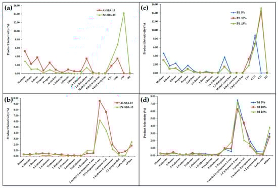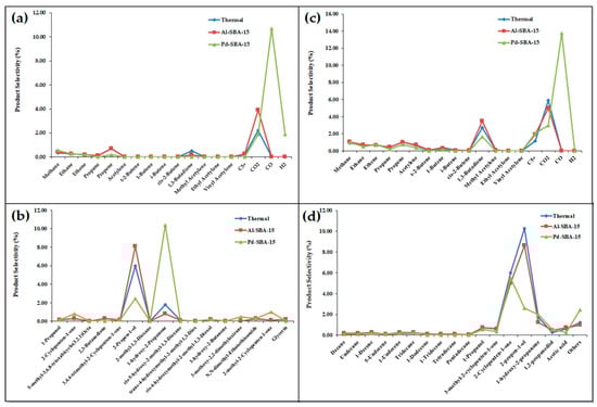 The effect of the catalyst type was compared for the Al-SBA-15 and Pd-SBA-15 catalysts in biodiesel waste cracking at 650 °C for 40 min. At this temperature, the catalysts did not show a significant difference in the obtained conversion level (~87%), as shown in Table 2. All of the reactions produced a higher selectivity for liquid than gas fractions. With respect to the heavy liquid fraction, Al-SBA-15 gave a higher selectivity for distilled liquid products (26%) than the others, while the Pd-SBA-15 catalyst increased the selectivity for the gas fraction to 33%. The product selectivities of this cracking reaction are shown in Figure 6. In the distilled liquid fraction, the main products were 2-cyclopenten-1-one and 2-propen-1-ol for both catalysts. Previously, several product types were obtained from glycerol transformation depending on the supported metallic species, where Co or Ru supported on SBA-15 gave 1-hydroxyacetone and acetone as the products, whereas propanediol and acetic acid were produced with Zn- or Cu-SBA-15 catalysts [29].