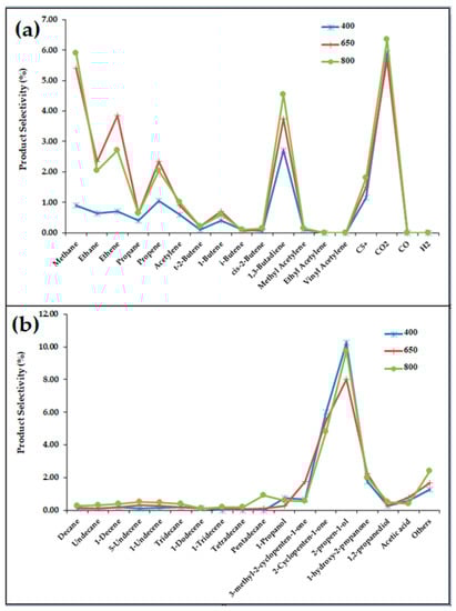 The biodiesel waste was reacted at 400, 650, and 800 °C for 40 min without a catalyst and the conversion level and product selectivity of the thermal cracking reactions are shown in Table 2 and Figure 5. The conversion level significantly increased from 63.5% to 85.0% when the reaction temperature was increased from 400 to 650 °C, and then slightly increased to 86.3% as the temperature was increased further to 800 °C. Likewise the residue level decreased dramatically and then slightly with increasing reaction temperature from 400 to 650 and 800 °C. At the low temperature (400 °C), the gaseous products were CO2 and 1,3-butadiene. Increasing the temperature to 650 °C increased the gas fraction selectivity from 14.5% to 28.2% and promoted the production of CO2, CH4, 1,3-butadiene, C2H4, C3H6, and C2H6, since the higher temperature caused the products to be cracked to smaller molecules. This trend reflected that reported in a previous study, where the yield of gaseous products increased as the glycerol pyrolysis temperature was increased from 400 °C to 800 °C [6]. Likewise, as the temperature increased, smaller gas molecules—CH4 and C2H4—were obtained, which is again consistent with other experimental data [7]. In addition, the selectivity of liquid products increased to 59%, which was comprised of an increase in heavy oil to ~35% without any significant change in the level of light oil (remained at ~22–24%), and mainly consisted of 2-propen-1-ol and 2-cyclopenten-1-one. Therefore, although 800 °C was likely to be an acceptable reaction temperature, this would result in a high energy consumption and so a temperature of 650 °C was considered as more suitable for the cracking process because a high yield of gas and liquid products were still obtained over the Pd-SBA-15 or Al-SBA-15 catalysts at this temperature, respectively.