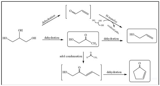 For the gas fraction from pure glycerol (Figure 4), the distribution of products was selective for CO2, except with Pd-SBA-15 that showed the highest amount of CO at around 11% along with CO2 and H2, similar to synthesis gas. The biodiesel waste was converted to CO2, 1,3-butadiene, C5+ and propene, but the Pd-SBA-15 catalyst still gave CO as the major gas product at around 14% (Figure 4c), which is from the decarbonylation of glycerol and MONG [26]. In this study, the distribution of the volatile liquid phases was selective for 1-hydroxy-2-propanone and 2-propen-1-ol for all of the catalysts when using the pure glycerol. When the reaction temperature was above the boiling point of glycerol (290 °C), the liquid fraction was transformed to 1-hydroxy-2-propanone by dehydration [33,34,35]. This was then reduced and dehydrated to 2-propen-1-ol, as shown in Scheme 1 for the transformation pathway of glycerol into liquid products. Usually, the harvested products in the liquid fraction are mainly produced via dehydration followed by H-transfer or aldol condensation [34,35]. Therefore, several researches have tried to reduce the gas phase production in order to enhance the yield of desired liquid compounds. The association of ZSM-5 and bentonite catalysts could decrease the production of the gaseous fraction via decarboxylation and decarbonylation reactions, giving a high yield of the liquid fraction [26]. As seen in this work, both types of products were observed and the product amount depended on the type of the starting material. With the biodiesel waste material, thermal and Al-SBA-15 cracking gave a higher content of 2-propen-1-ol than 2-cyclopenten-1-one. In contrast, the Pd-SBA-15 catalyst gave 2-cyclopenten-1-one as the major product, which was formed from reacting with acetaldehyde, the catalytic cracking product of MONG, and by aldol condensation.