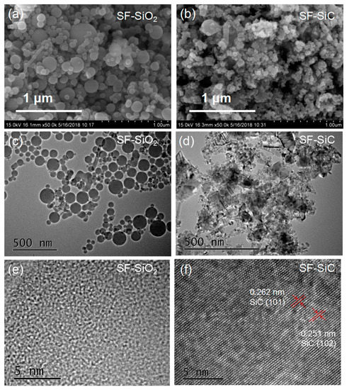SEM images of the samples: (a) SF-SiO2, (b) SF-SiC; HRTEM images of samples: (c,e) SF-SiO2; (d,f) SF-SiC.