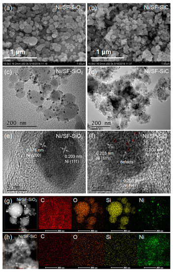 SEM images of the samples: (a) Ni/SF-SiO2, (b) Ni/SF-SiC. HRTEM images of the reduced catalysts: (c,e) Ni/SF-SiO2 and (d,f) Ni/SF-SiC. HRTEM elemental mapping images of C, O, Si and Ni of (g) Ni/SF-SiO2 and (h) Ni/SF-SiC.