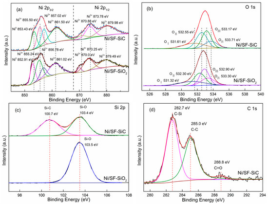In Figure 6b, the O 1s spectra of Ni/SF-SiO2 and Ni/SF-SiC catalysts could be distinguished into four sub-peaks: The weakly binding energy peaks (OI and OII) were related to the surface lattice oxygen and the adsorbed oxygen [44], respectively; the higher binding energy (OIII and OIV) corresponded to the defects with a low oxygen coordination and the metal-oxygen bonds, respectively [45]. The binding energy of O 1s of Ni/SF-SiC was higher than Ni/SF-SiO2, demonstrating that the stronger metal-support interactions between Ni and SF-SiC [21]. For the catalysts, the presence of Ni3+ and OIII could further promote the activity of reactive sites in methanation [45]. In Figure 6c, the Si 2p binding energy of 100.7 eV and 103.0 eV were attributed to the Si–C and Si–O bond in Ni/SF-SiC, respectively. There is only an Si–O bond in Ni/SF-SiO2 [46]. In Figure 6d, the spectrum C 1s of Ni/SF-SiC (282.7, 285.0, 288.8 eV) corresponded to C–Si, C–C and C=O, respectively [47].