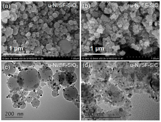 SEM images of the samples: (a) Used Ni/SF-SiO2, (b) used Ni/SF-SiC. HRTEM images of (c) used Ni/SF-SiO2 and (d) used Ni/SF-SiC.