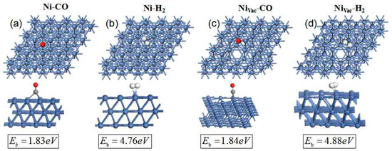 The Vienna ab initio simulation package (VASP) was employed for the first-principles calculations [48,49]. The generalized gradient approximation was in the Perdew–Burke–Ernzerhof (PBE) form [50]. Chemisorption of CO and H2 on the surface of catalyst to ensure that the C–O and H–H bonds were sufficiently activated is the necessary prerequisite to a high-performance methanation catalyst [51]. Therefore, the adsorption of CO and H2 on Ni- and Nivac-based catalysts was investigated. Two stable adsorption configurations were taken into account, as shown in Figure 8. For the Ni-CO and Nivac-CO configuration, both two C atoms interacts with metal atom, forming C–Ni bonds (Figure 8a,c). For the Ni-H2 and Nivac-H2 structure, only one Ni atom interact with two H atoms, forming Ni–H bonds (Figure 8b,d). From the above adsorption structure, the calculated binding energy (Eb) of CO and H2 on defect-free Ni and Nivac are presented in Figure 8. The adsorption energy (absolute value) of CO and H2 in Nivac was 1.84 and 4.88 eV respectively, which were significantly larger than that of CO and H2 on defect-free Ni (1.83 and 4.76 eV, respectively.), indicating that the vacancies in the Ni structure were more favorable for adsorbing CO and H2 molecules [52,53]. Accordingly, the defect-rich Ni catalysts were superior to the defect-free Ni catalysts in the methanation.