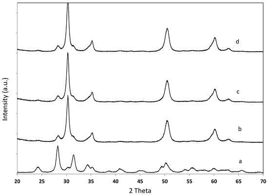 Zirconia is a support that has a certain redox capacity [64]; it presents polymorphs with controllable acid–base properties and good thermal stability. Besides, in its amorphous hydrous state, it presents a high surface area that can favor the dispersion of the supported precursors, and thus avoid agglomeration during the thermal treatments [64,65,66].