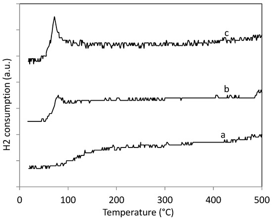 In order to analyze the presence of reducible phases in the catalysts, TPR analyses were carried out, and the results are depicted in Figure 4. The TPR diagram of the pure ZrO2 (not shown) does not present any signal, which indicates the absence of reducible phases at the studied temperature range, although it is known that it can be partially reduced at high temperature (about 800 °C). The TPR diagrams of the catalysts containing 5 and 10 wt.% of Ag presented a signal at very low temperature (approximately 90 °C). This can be assigned to the reduction of oxidic or cationic Ag species, in low concentrations, which are well-dispersed on the support, or presenting low interactions with it. This signal also can be assigned to superficial oxygen atoms coming from its migration from zirconia [58]. The integrated area of the signal increases with the increase of Ag content. However, it is noteworthy that all the AgxZ catalysts had an extremely low level of H2 consumption (Table 1), which is lower than the expected if the supported phase corresponds to the stoichiometric reduction of the Ag2O oxide (Equation (1)).