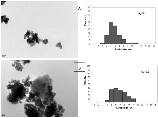 TEM micrographs and histograms of particle size distribution: (A) Ag5Z catalyst; (B) Ag10Z catalyst.