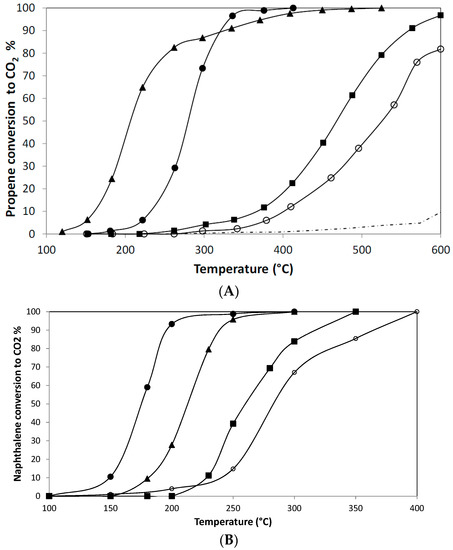 (A) Catalytic activity in propene oxidation: (----) without catalysts, (o) ZrO2, (■) Ag1Z, (●) Ag5Z, (▲) Ag10Z. (B) Catalytic activity in naphthalene oxidation: (o) ZrO2, (■) Ag1Z, (●) Ag5Z, (▲) Ag10Z.