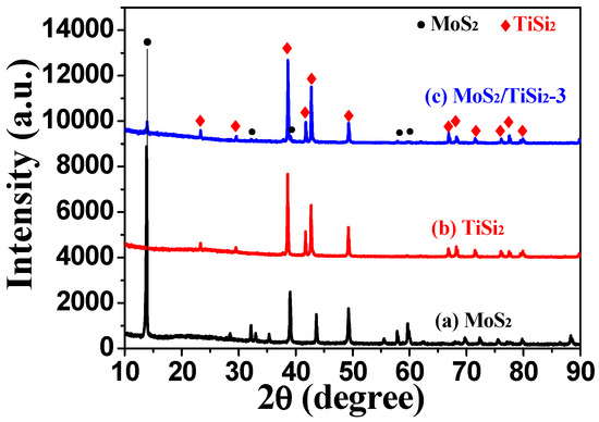 XRD patterns of the MoS2 (a), TiSi2 (b), and MoS2/TiSi2-3 (c).