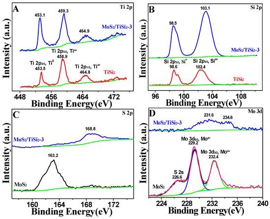 XPS was carried out and the corresponding results are shown in Figure 3 and Figure S3. Figure 3A shows the high-resolution Ti 2p XPS spectra of the samples. The peaks located at 453.5, 458.9, and 464.8 eV are attributed to Ti0 p3/2, Ti4+ p3/2, and Ti4+ p1/2 [10,18], respectively. The peaks located at 98.6 and 102.4 eV in the pattern of TiSi2 (Figure 3B) were attributed to Si0 p3/2 and Si4+ p3/2 [18,19]. Comparing the above peak positions with those of MoS2/TiSi2, the binding energy of Ti4+ and Si4+ in MoS2/TiSi2-3 is higher than in TiSi2, while the binding energy of Ti0 and Si0 in MoS2/TiSi2-3 is lower than in TiSi2. The peak located at 163.2 eV confirms the presence of S2− in MoS2 (Figure 3C). The blue shift of the S 2p peak position of MoS2/TiSi2-3 can be clearly observed. The changes in binding energy of S were possibly due to the S‒Ti and S‒Si bond formation. The shift of the relative peak position is attributed to the interaction of TiSi2 with MoS2 [1,18,20]. Figure 3D demonstrates the XPS spectra of Mo 3d for MoS2 and MoS2/TiSi2-3. The Mo 3d peak positions of MoS2/TiSi2-3 also shift to higher binding energies, indicating a low load of MoS2 and the remarkable combination effect of MoS2 and TiSi2 [14,21].