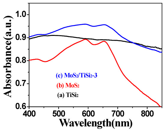 Figure 4 exhibits the UV-vis absorption spectra of the obtained samples. The absorption of pure TiSi2 is in the range of ca. 400 up to 850 nm, where its absorption is higher than that of MoS2. The MoS2/TiSi2-3 sample demonstrates higher absorption intensity compared with MoS2 and TiSi2, indicating that the MoS2/TiSi2 composite possesses enhanced ability for harvesting visible light.