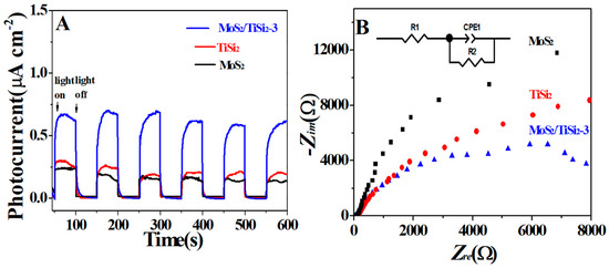 The photocurrent responses for TiSi2, MoS2, and MoS2/TiSi2-3 are displayed in Figure 5A. The photocurrent density of TiSi2 or MoS2 is rather low (ca. 0.22 μA·cm−2). The photocurrent density of MoS2/TiSi2-3 (0.59 μA·cm−2) is more than 2.6 times that of TiSi2 in the same irradiation conditions. The results suggest the positive synergetic effect between MoS2 and TiSi2, which leads to enhanced photoinduced chargers transfer and separation. Figure 5B shows the electrochemical impedance spectra (EIS) of the samples are shown in. The diameter of the semicircle of MoS2/TiSi2-3 plot is obviously smaller than that of MoS2 and TiSi2, which indicates effectively enhanced carrier transfer at the interface between the MoS2/TiSi2-3 electrode and the electrolyte [22]. The experimental data for all the electrodes can be expressed as an equivalent circuit, displayed as shown as the inset of Figure 5B, in which CPE1 is constant phase elements connected in parallel with R2 [23,24], R2 is the resistance of solution, and the ohmic series resistance (R1) is the resistance of charge-transfer resistance at interfaces [25,26].