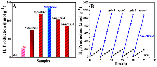 The photocatalytic activity for H2 production of the samples are shown in Figure 6 and Figure S4. MoS2 alone shows little photocatalytic activity. The hydrogen production rate for TiSi2 is 38.4 μmol·h−1·g−1. The hydrogen production rate for the MoS2/TiSi2-1 sample increases to 119.6 μmol·h−1·g−1. The photocatalytic activity of the MoS2/TiSi2 augments with the increasing of the quantity of MoS2 in MoS2/TiSi2. The hydrogen production rate of the MoS2/TiSi2-3 sample reaches the maximum value 214.1 μmol·h−1·g−1, which is approximately 5.6 times that of TiSi2. The fact that composite catalysts exhibit much enhanced activity for H2 evolution can be attributed to the synergistic effect between TiSi2 andMoS2. Through the heterojunction formed between MoS2 and TiSi2, the photogenerated electrons in TiSi2 easily transfer to the conduction band of MoS2, which inhibits the recombination of e−-h+, thus improving the photocatalytic activity.