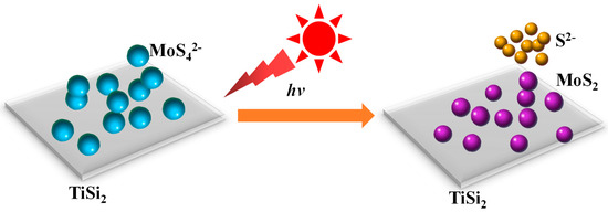 Scheme 1 shows the proposed formation mechanism of the MoS2/TiSi2 photocatalyst. The electrons are generated at the VB of TiSi2 are excited by visible-light, which in turn reduce [MoS4]2− to MoS2 [16], as shown in Equation (1):