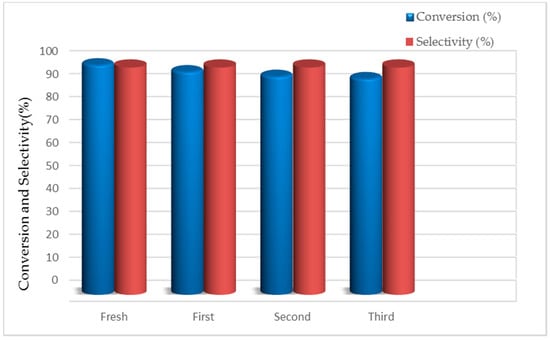 Furthermore, we have evaluated the recyclability of the heterogeneous catalyst in the model reaction. The final reaction mixture, including MK10 and the product, was treated with a green solvent such as ethyl acetate [81]; the catalyst was separated from the solution by filtration, washed with ethyl acetate (3 mL) four times, and dried in an oven (80 °C) to remove traces of the solvent. Afterwards, the combined organic phases were concentrated under a vacuum, and the crude product was analyzed by GC-MS. The recovered catalyst was used directly for the next run, with the addition of fresh reagents. Thus, the second reaction mixture was subjected again to the above-described procedure, and further reaction cycles were repeated by using the previously recycled MK10.